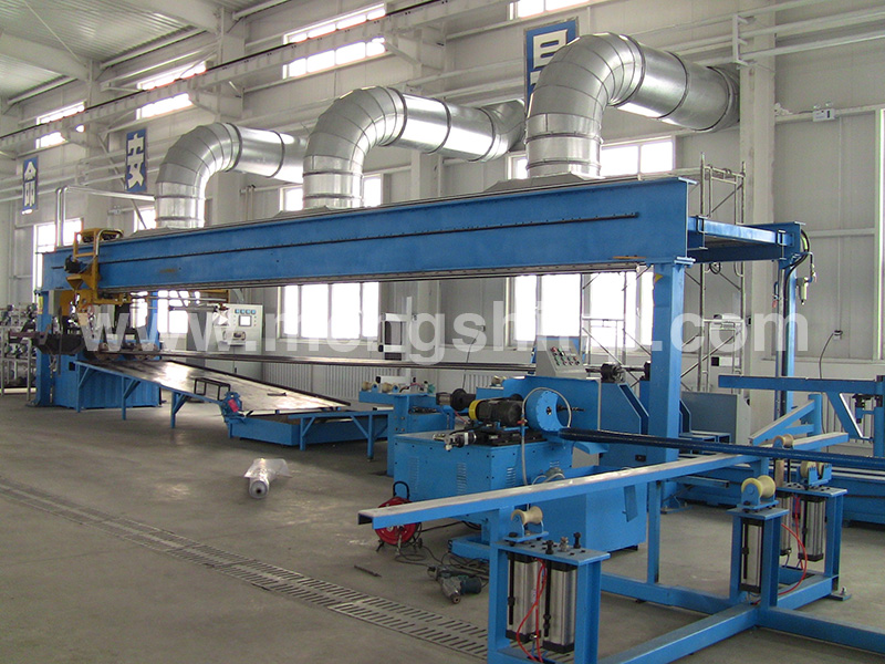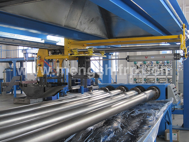 管體的脫模(管體與模具分離)操作是在纏繞機組上在線完成。該脫模系統(tǒng)主要由鋼制管模具的水冷系統(tǒng).多功能尾座、鋼制軌道、氣動支承架、托動系統(tǒng)等組成。